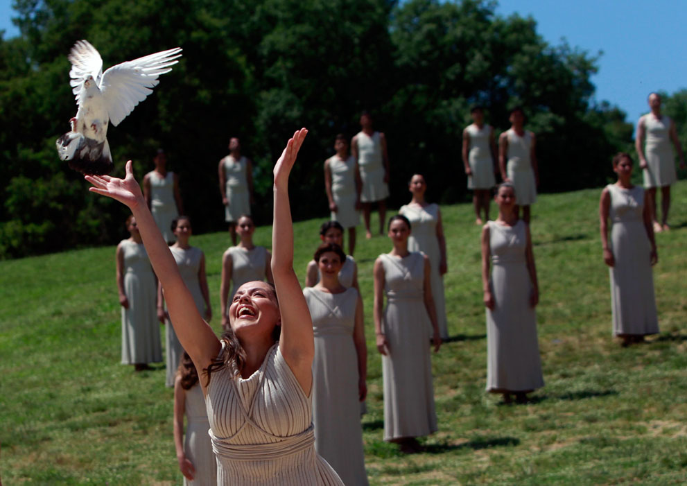 Μια ιέρεια, απελευθερώνει ένα περιστέρι στην πρόβα
